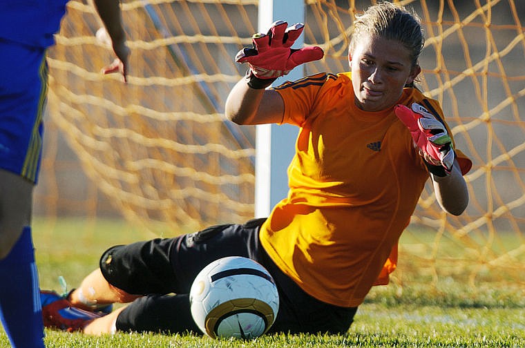 Flathead junior keeper Zoe Zander makes a save Thursday afternoon during Flathead's 3-2 playoff victory over Missoula Big Sky at Kidsports Complex.