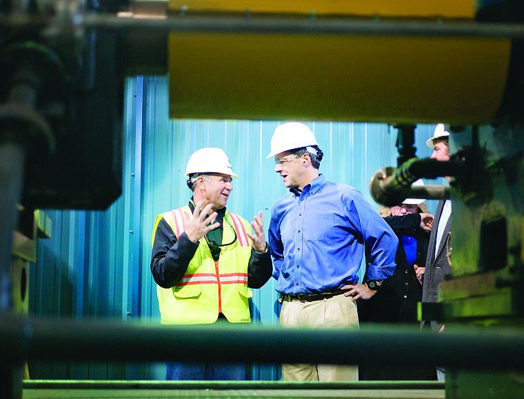 Chuck Roady, F.H. Stoltze Land and Lumber Co. vice president and general manager, left, talks about the company’s new $22 million co-generation plant with Montana Gov. Steve Bullock Thursday during a tour of the facility in Columbia Falls.