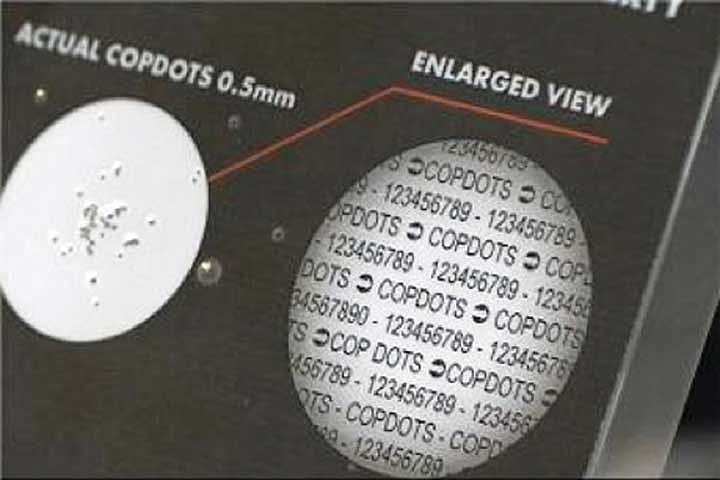 To help make it easier to identify stolen property, the sheriff's office will be utilizing tiny "DNA dots," called CopDots, a pen-like applicator holding an adhesive containing thousands of tiny discs, or dots, that residents can apply to their property. The discs are marked with a unique code that can only be read with a powerful magnifying lens, and can be traced to its owner. Just one pen, costing about $30, can be used to mark about 50 items. The dots can be applied to anything from landscaping equipment to auto parts, jewelry and electronics.