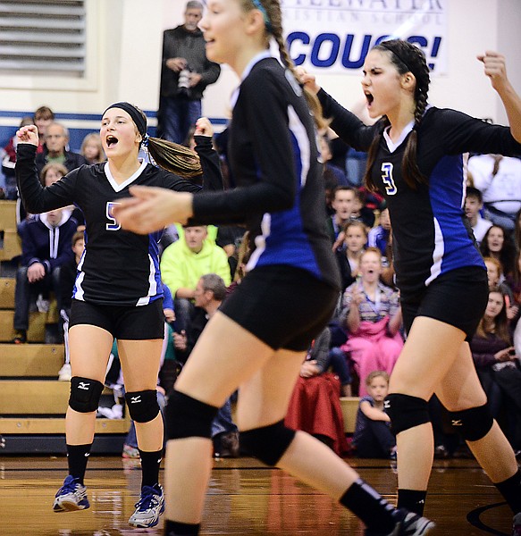 Stillwater freshman Adrianna Lambert (5) and teammates celebrate a point during the 2013 MCAA state volleyball tournament Saturday at Stillwater Christian School.