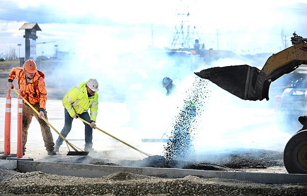 Workers begin paving the bypass near the intersection of U.S. 93 and West Reserve on Monday in Kalispell. (Brenda Ahearn/Daily Inter Lake)