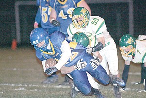Quarterback Jared Winslow with a gain of 4 in second quarter vs. Whitefish. Bulldogs Brian FauntLeRoy center, and Logan Wynn on the tackle.