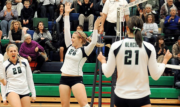 Glacier junior Brielle Bumgarner (26), center, and her teammates celebrate during the game against Missoula Hellgate on Tuesday, October 29, in Kalispell. (Brenda Ahearn/Daily Inter Lake)