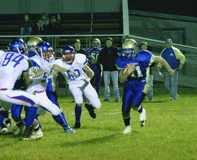 Jake Smith carries the ball down the field during the Bluehawks' last game of the season. Smith played his last game of his high school career.