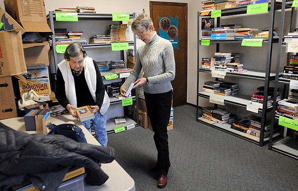 From left, Gail Long of Kalispell and Linda Harris of Whitefish, sorting books in advance of the annual book sale on Thursday, October 31, in Kalispell. (Brenda Ahearn/Daily Inter Lake)