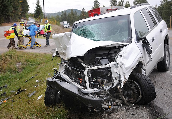 The collision on U.S. 93 mangled the front end of this sport utility vehicle. Two trucks, a small car and the SUV were involved.