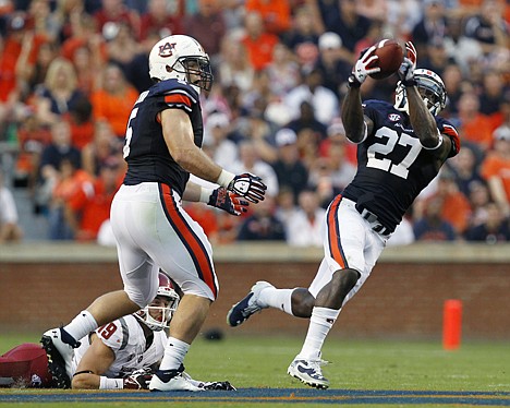 Auburn’s Robenson Therezie picked off two passes in his first game as a starter, including one in the end zone with less than five minutes remaining, for the Tigers (1-0). They had managed just two interceptions during last season’s 3-9 debacle.