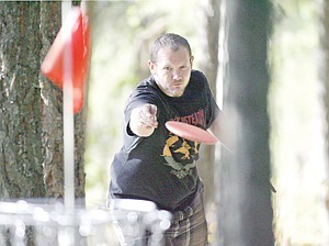 Open Pro disc golfer Brandon Green of Spokane, Wash., hits the 260-foot, par 3 No. 2 basket during the Montana Disc Golf State Championships held in Libby and Troy Saturday. Mr. Green took home $165.