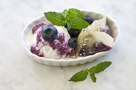 Thinking about pot stickers recently, it occurred to me that if you swapped out the savory for something sweet, you'd have a dandy little dessert on your hands. And this time of year, when I think sweet, I think blueberries. They're still thick on the bushes at summer's end when we take our annual vacation at my parents' farm. I had a feeling that blueberries would show up very well in a dessert pot sticker.
