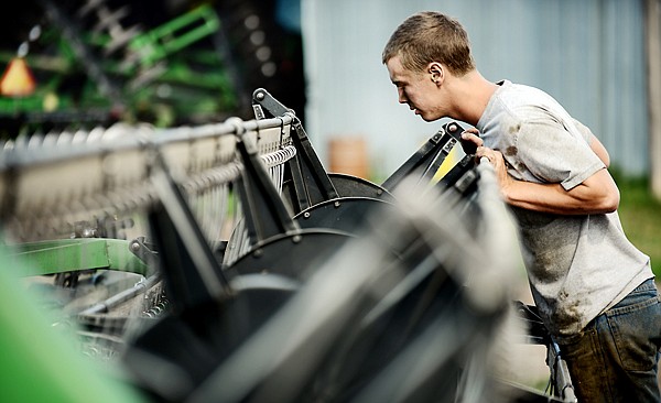 Isaac Morden works on cleaning up a combine after completing most of their harvest on Wednesday morning, September 4, in the Montford/Egan region east of Kalispell. (Brenda Ahearn/Daily Inter Lake)