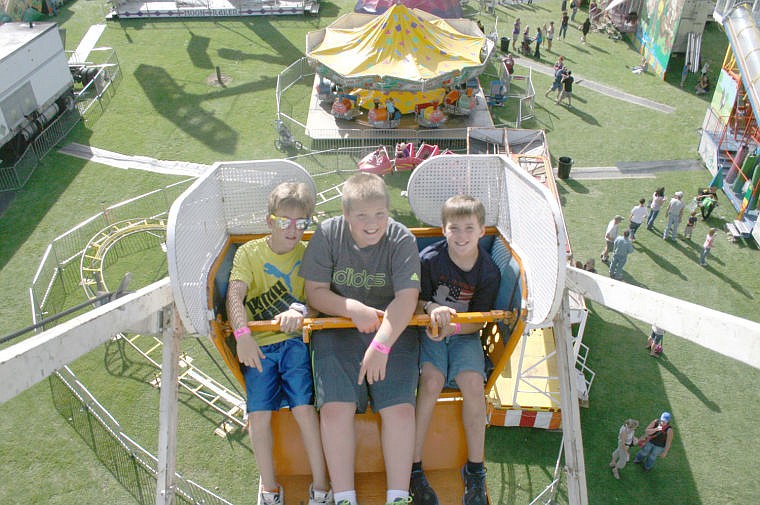 Nathan Schraeder, Ryan Schraeder, and Jake Jacobson ride the ferris wheel at the Sanders County Fair. The ferris wheel was a popular ride and saw scores of kids.