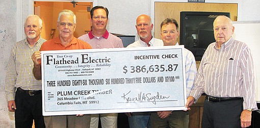 Plum Creek Timber Co. received the $386,635 check for a project at its sawmill in Columbia Falls that will save the company 1.7 million kilowatt-hours per year — about what 150 average U.S. homes consume per year.