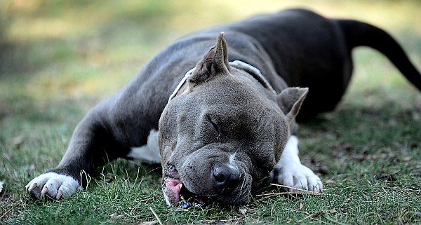 Stoney, a pocket bully, enthusiastically chews up a ball on Wednesday at Big Sky Bully Pit Bulls.