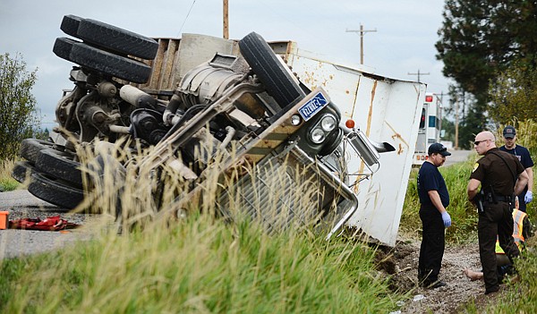 Flathead County Sheriff's Deputy Sam Cox and members of the Evergreen Fire Department respond to the scene of a rollover accident on Helena Flats Road on Monday morning, Sept. 9, north of Kalispell. The driver of the truck was temporarily pinned and extricated from the wreck. He was able to walk away from the scene after answering questions about the wreck, but was taken to Kalispell Regional Medical Center for formal evaluation. (Brenda Ahearn/Daily Inter Lake)