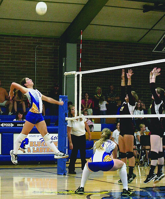 Angela Padden of Thompson Falls goes up for a spike during a recent match against Florence.