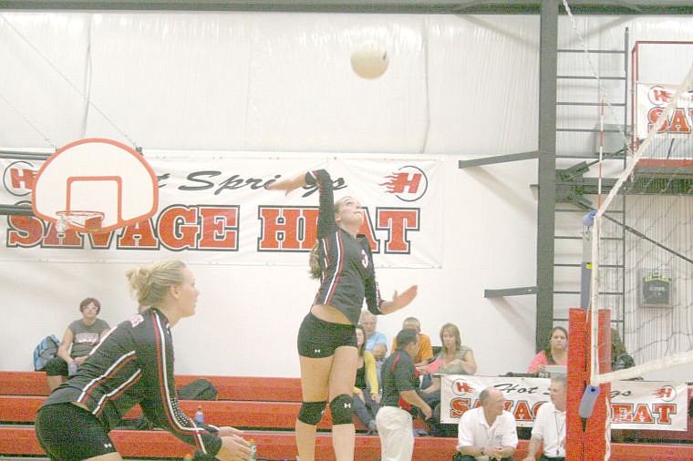 Alex Green, left, of the Lady Savage Heat, prepares for a block off the shot from her teammate during a recent match in Hot Springs.