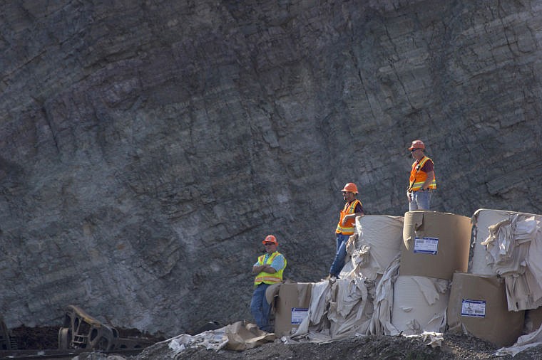 MRL emplyees survey and work on clearing the section of track littered with debris.