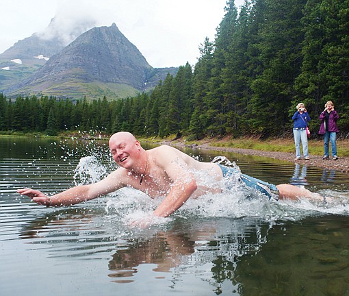 Rain dripped off the trees and a cool breeze blew over Fishercap Lake in Glacier National Park's Many Glacier area on Sunday. A perfect day for a swim. At least if you were Marc Ankenbauer it was.