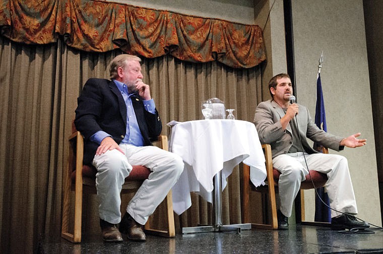 Airport expansion opponent Chad Graham, right, talks during a recent Chamber-sponsored forum while airport supporter Jim Lynch listens.