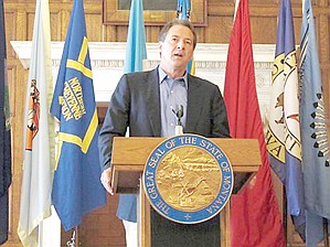 Montana Gov. Steve Bullock talks about the state's Labor Day report on Friday, Aug. 30, 2013, in Helena, Mont. The report says Montana this year should regain all the jobs it lost during the recession, but lower productivity and an aging workforce are cause for concern. (AP Photo/Matt Volz)