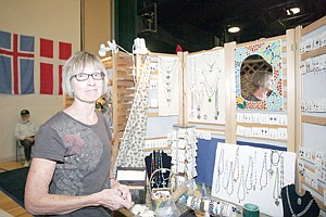 Libby's Candy Steele pauses while readying her "Glass Artery" booth Thursday afternoon in preparation for Nordicfest. Steele has been making stained glass items for the past 33 years.