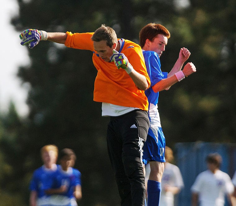 Bigfork senior keeper Dillon Hilling (left) celebrates with teammate Steven Lyon after Bigfork's third goal Tuesday night during Columbia Falls' matchup against Bigfork at Columbia Falls High School. Sept. 17, 2013 in Columbia Falls, Montana. (Patrick Cote/Daily Inter Lake)