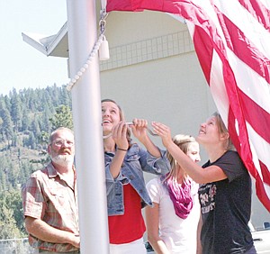 Kellie Lundin, left, and Allie Coldwell, right, raise the flag as Phillip Lundin, left and Katie Lundin look on during the Bobby Coldwell flagpole dedication Friday at Morrison Elementary.