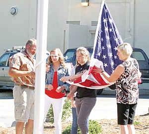 Phillip Lundin, left, Kellie Lundin, Katie Lundin, Allie Coldwell and Allison Lundin prepare to raise the flag Friday afternoon during the Bobby Coldwell flagpole dedication at Morrison Elementary.