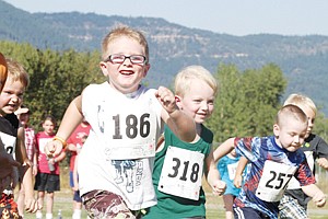A smiling Westin Folk, 5, speeds toward the finish line Friday at Libby Elementary during Runnerfell 2013.