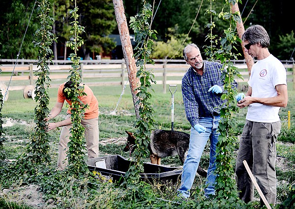 Ranch owner Tom Britz, center, speaks with Great Northern Brewing Company Owner/General Manager Marcus Duffey, left, and Great Northern Brewing Company Head Brewer Joe Barberis as they harvest hops on Tuesday, September 17. (Brenda Ahearn/Daily Inter Lake)