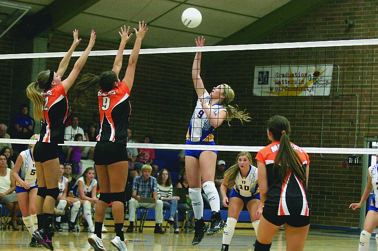 Madison Fitchett takes on Ronan defenders at the net during a recent game in Thompson Falls.