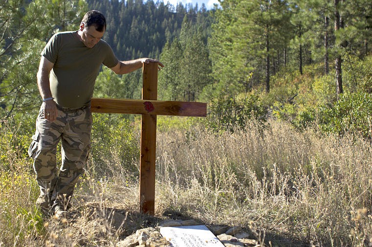 Tom Logan spends a moment in silence next to his son's grave on Sept. 6, Joey's birthday, after securing a wood cross.