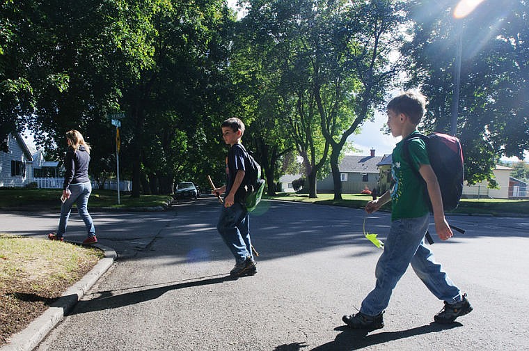 Shanda Elavsky walks her sons Chase, center, and Tristan home from Russell Elementary School on Thursday afternoon. Elavsky is concerned about the lack of sidewalks on the streets between Russell Elementary and her home on Third Avenue East North.
