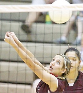 Senior Katie Lundin sends the ball over in first game vs. Libby 9-17-13.