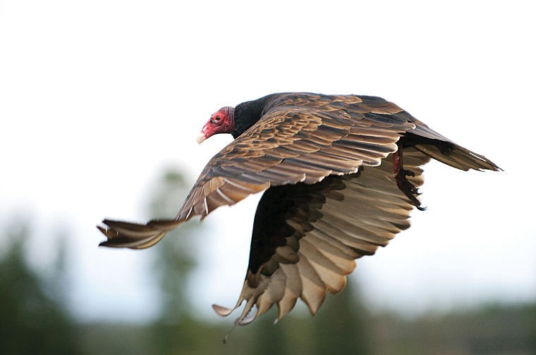 A turkey vulture flies over a field Monday afternoon near Helena Flats Road east of Kalispell.