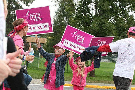 Little 2-and-a-half-year-old Greta wore a pink stocking cap and looked delighted as she bobbed up and down alongside her 4-year-old brother Cal. Their vantage point allowed them to look out on all the other people wearing pink and participating in the 14th annual Susan G. Komen Coeur d'Alene Race for the Cure.