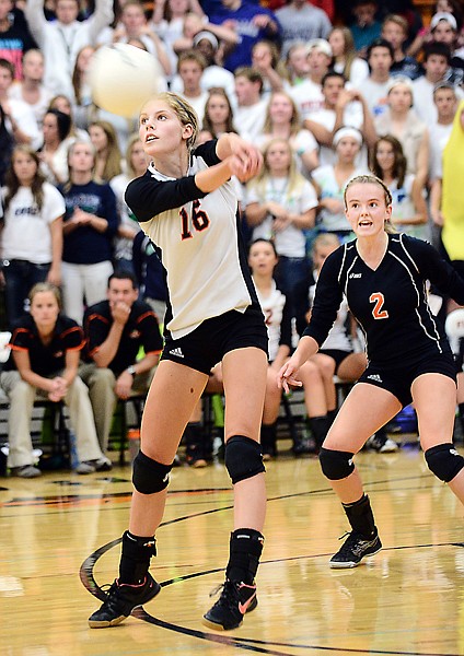Flathead senior Emma Andrews (16) passes the ball during game two of the Crosstown match up against Glacier on Tuesday, September 24, at Flathead. Glacier won in three sets. (Brenda Ahearn/Daily Inter Lake)