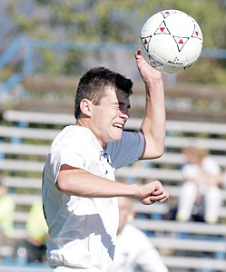 Junior midfielder Collin Johnson header off of a Jason Schnackenberg inbound pass in first half vs. Polson 9-19-13.