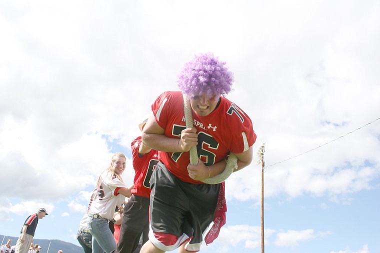 Senior Michael Locker strains to pull the rope during the tug-of-war contest in Hot Springs.