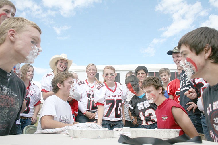 From left to right: Joe DeTienne, Sam Hoff, Wyatt Carr and Lane Foster face off during the pie eating contest at the homecoming games in Hot Springs.