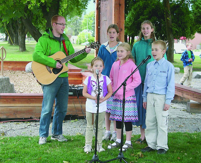 Brian Iseminger, teacher at Trout Creek Adventist School, plays guitars and sings with his students at the first ever Music in the Parks event hosted in the Rose Garden Park in Thompson Falls.