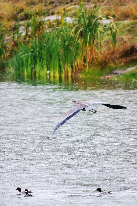A great blue heron flies over Pine Grove Pond on Wednesday morning.