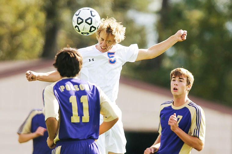 Columbia Falls senior Caleb Baumann (5) goes up for a header Thursday afternoon during Columbia Falls' matchup against Polson at Flip Darling Field in Columbia Falls.