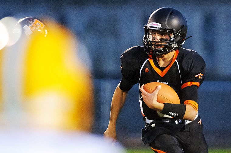 FLATHEAD quarterback Easton Johnson runs during Flathead’s Class AA homecoming football game with C.M. Russell at Legends Stadium Friday night.
