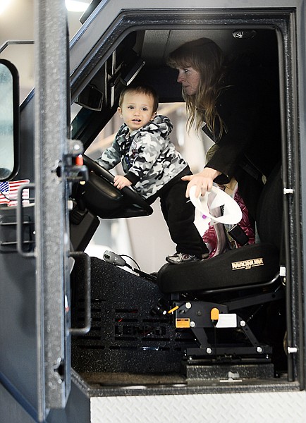 Ethan Clark, 15 months, of Kalispell looks out from the drivers seat of the Kalispell Police Department Bear on Saturday, September 28 at the Flathead Family Fun Day & Safety Expo in Kalispell. Also in the photo is Clark's grandmother Tracy Mayhood of Kalispell. (Brenda Ahearn/Daily Inter Lake)
