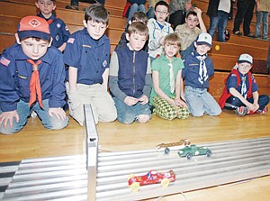 Sam Stinson, left, Rusty Gillespie, Grant Larson, Maellen Nelson, Bo Sanderson and Caleb Moeller watch intently Saturday during Pinewood Derby 2014 at Libby Elementary. In all there were 17 contestants with the top prize going to Sean Sanderson who set a new track record of 162.2 scaled mph, beating a previous record by Declan Faulkner of 161.0.