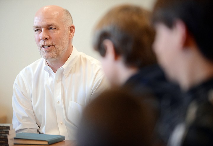 Greg Gianforte talks with students on Tuesday afternoon at Sykes’ in Kalispell. Gianforte also met with local business leaders and talked about his plan to create better-paying jobs in Montana.
