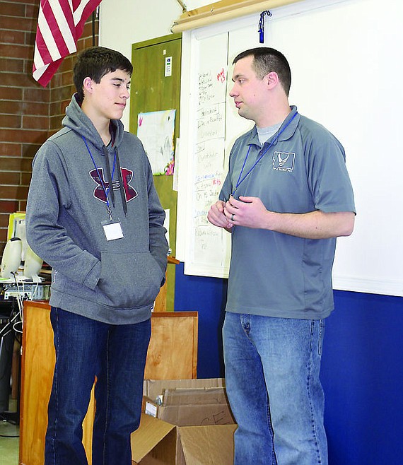 Plains student Chayton Lulack stays after the presentation to ask TSGT Joshua Holderman questions.