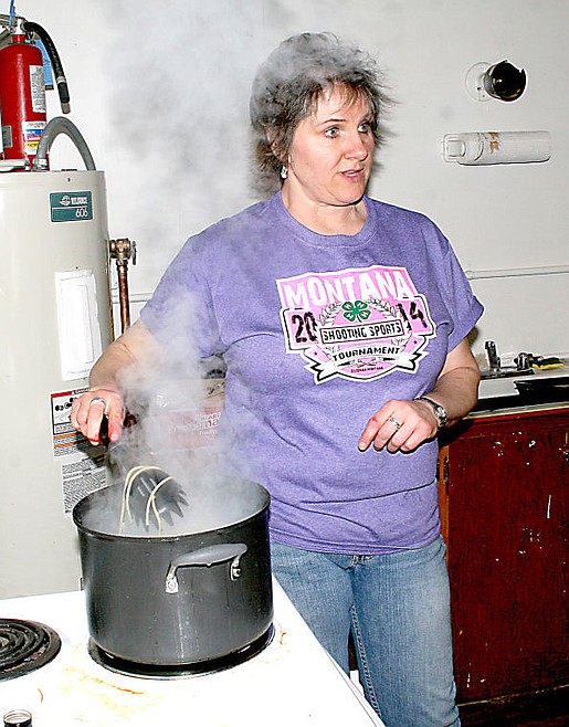 Michele Parkin stirs a pot of spaghetti at the Superior 4-H building during the shooting sport spaghetti feed. The event was a fundraiser to send two shooters to the NRA National Championship.