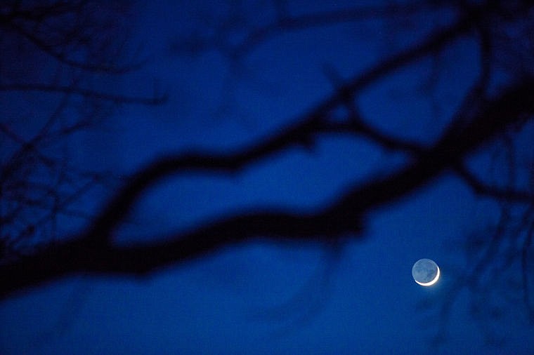 A waxing crescent moon is seen through the trees Tuesday night from Kalispell.
